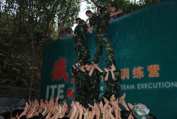 (六)畢業(yè)墻。全體團(tuán)隊的每個成員,不借助身體外的任何工具,齊心協(xié)力,在規(guī)定的時間內(nèi),翻越一面高達(dá)4.2米的光滑墻面。這是本次特訓(xùn)營的最后一個項目,是對全體參訓(xùn)團(tuán)隊整合團(tuán)隊增強(qiáng)士氣和凝聚力最后的一個考驗。