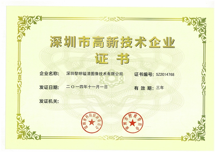 近日,深圳黎明鎰清圖像技術(shù)有限公司獲得由深圳市科技創(chuàng)新委、深圳市財政委聯(lián)合頒發(fā)的《高新技術(shù)企業(yè)證書》,標(biāo)志著黎明鎰清正式通過了深圳市高新技術(shù)企業(yè)認定,成為深圳市級高新技術(shù)企業(yè)。