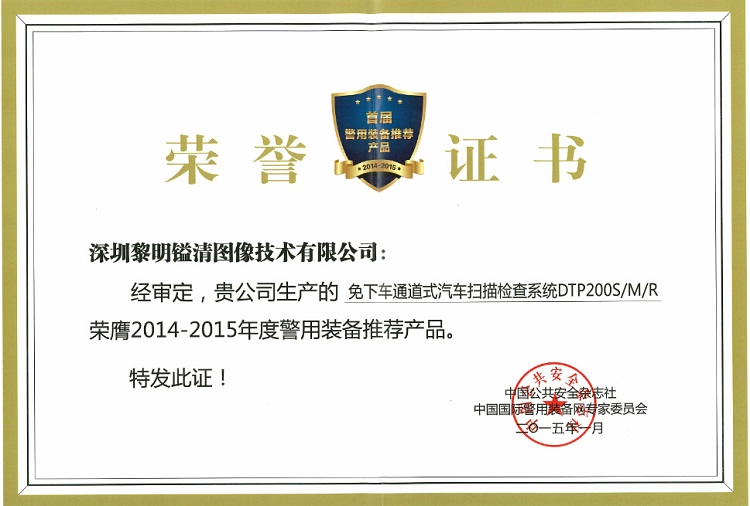 1月7日,由中國公共安全雜志社、深圳市安全防范行業(yè)協(xié)會CPS中安網(wǎng)聯(lián)合推出的“首屆警用裝備推薦產(chǎn)品”獎深圳隆重揭曉。特發(fā)黎明鎰清公司生產(chǎn)的“免下車通道式汽車掃描檢查系統(tǒng)DTP200S/M/R”榮膺2014-2015年度警用裝備推薦產(chǎn)品。