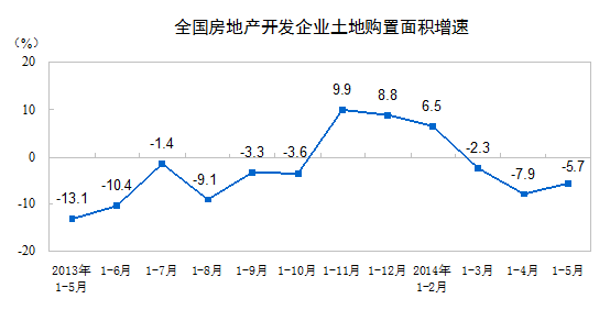 1-5月份,房地產(chǎn)開發(fā)企業(yè)土地購置面積11090萬平方米,同比下降5.7%,降幅比1-4月份收窄2.2個(gè)百分點(diǎn);土地成交價(jià)款2954億元,增長8.7%,增速回落0.9個(gè)百分點(diǎn)。